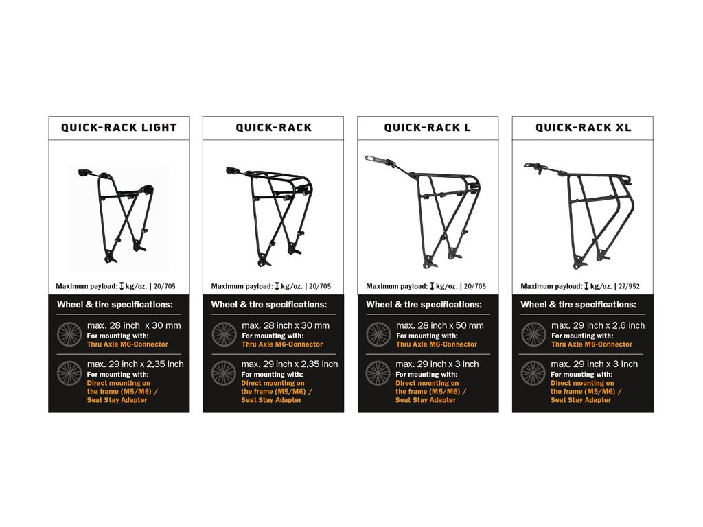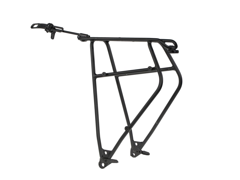 Szukasz tylnego bagażnika do swojego lekkiego roweru sportowego, który można szybko zamontować i zdjąć w razie potrzeby? Ortlieb Quick Rack spełnia te wymagania i jest całkowicie elastyczny. Montaż zajmuje zaledwie 15 sekund, a demontaż tylko 5 sekund. Pręty o średnicy 10 mm wytrzymują obciążenie do 26 kilogramów. Quick Rack jest oczywiście odpowiedni i kompatybilny do stosowania ze wszystkimi systemami toreb ORTLIEB, dzięki czemu można go łączyć z dowolną torbą ORTLIEB . Dzięki dwóm poziomom zawieszenia i platformie można jednocześnie używać i mocować torby oraz koszyk. Opcjonalne błotniki zapewnią Ci suchość i czystość nawet podczas złej pogody. Ortlieb Quick-Rack XL to prawdziwy „ciężarówka” i może być stosowany do rowerów i opon o rozmiarze 29 x 2,6" przy montażu na stałej osi i do 3" przy montażu bezpośrednim. W mgnieniu oka zamień swój rower w rower transportowy do zakupów i dojazdów do pracy i z powrotem. Maksymalna nośność 20/26 kg Maksymalny rozmiar kół to 29 x 2,6" przy montażu na sztywnej osi i do 3" przy montażu bezpośrednim Montaż również na rowerach z pełnym zawieszeniem W zestawie zestaw montażowy do QL3.1 Możliwość połączenia z jednym z trzech błotników (w zależności od szerokości opony) Rodzaje bagażników rowerowych Ortlieb Quick Rack Punkty montażowe bagażników Ortlieb Quick RackParametry dodatkowe