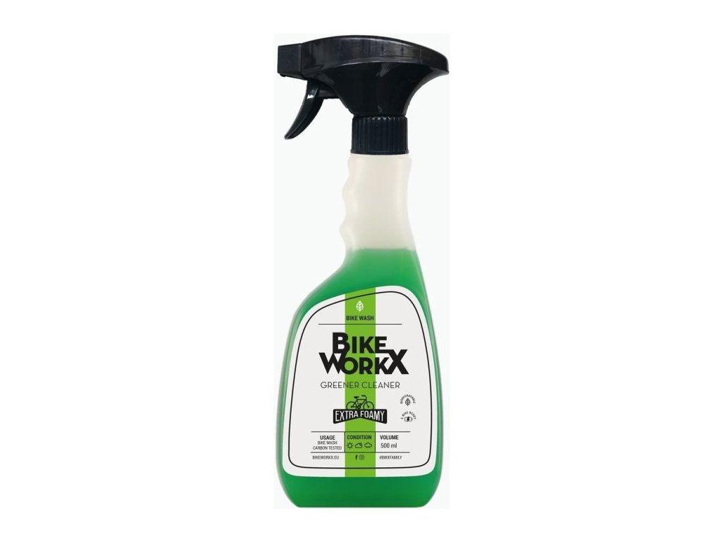 Środek do czyszczenia rowerów BikeworkX Greener Cleaner, opakowanie 500 ml z rozpylaczem Sprawdzony produkt do konserwacji i czyszczenia rowerów. Łatwo, szybko i wygodnie usuwa zabrudzenia i tłuszcz z powierzchni rowerów. Zawiera inhibitory korozji. Sposób użycia. Pozostawić pianę do działania lub rozprowadzić ją pędzlem lub szmatką. Po około 30 sekundach spłukać wodą. W przypadku silnie zabrudzonych powierzchni powtórzyć czynność. Po umyciu i wysuszeniu konserwować zalecanymi środkami smarnymi.Parametry dodatkowe