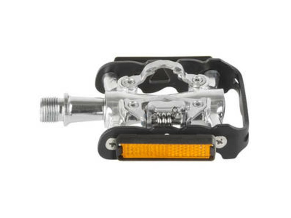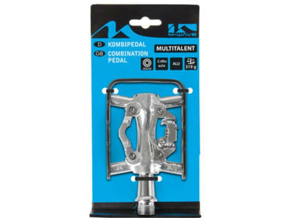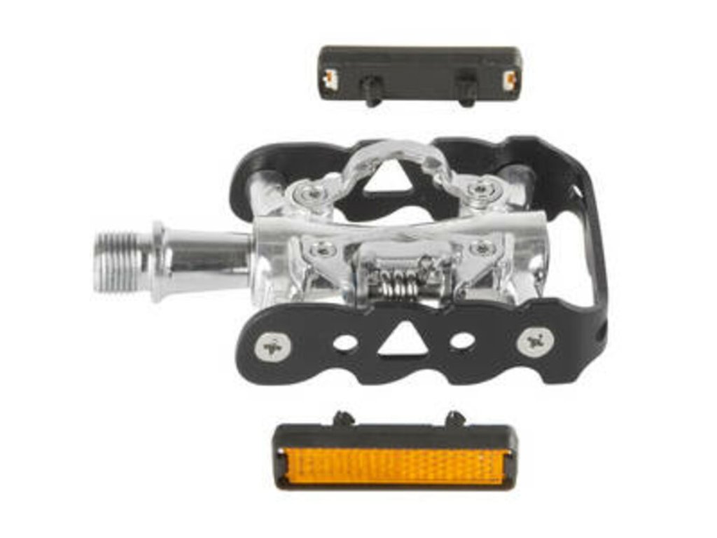 M-WAVE Peasy pedały kombinowane - klasyczne obuwie lub rowerowe SPD Aluminiowe pedały kombinowane M-WAVE Peasy z odłączanymi odblaskami. Dzięki tym pedałom zawsze będziesz gotowy do drogi, niezależnie od tego, jakie obuwie masz na sobie. Pedały są kompatybilne zarówno z profesjonalnymi pedałami SPD Shimano, jak i klasycznym obuwiem, gdy nie chcesz zakładać pedałów SPD. Pedały mają solidną oś CrMo i ważą 319 g/para. Montaż jest bardzo prosty za pomocą śruby imbusowej. Długość wynosi klasyczne 63 milimetry.Parametry dodatkowe