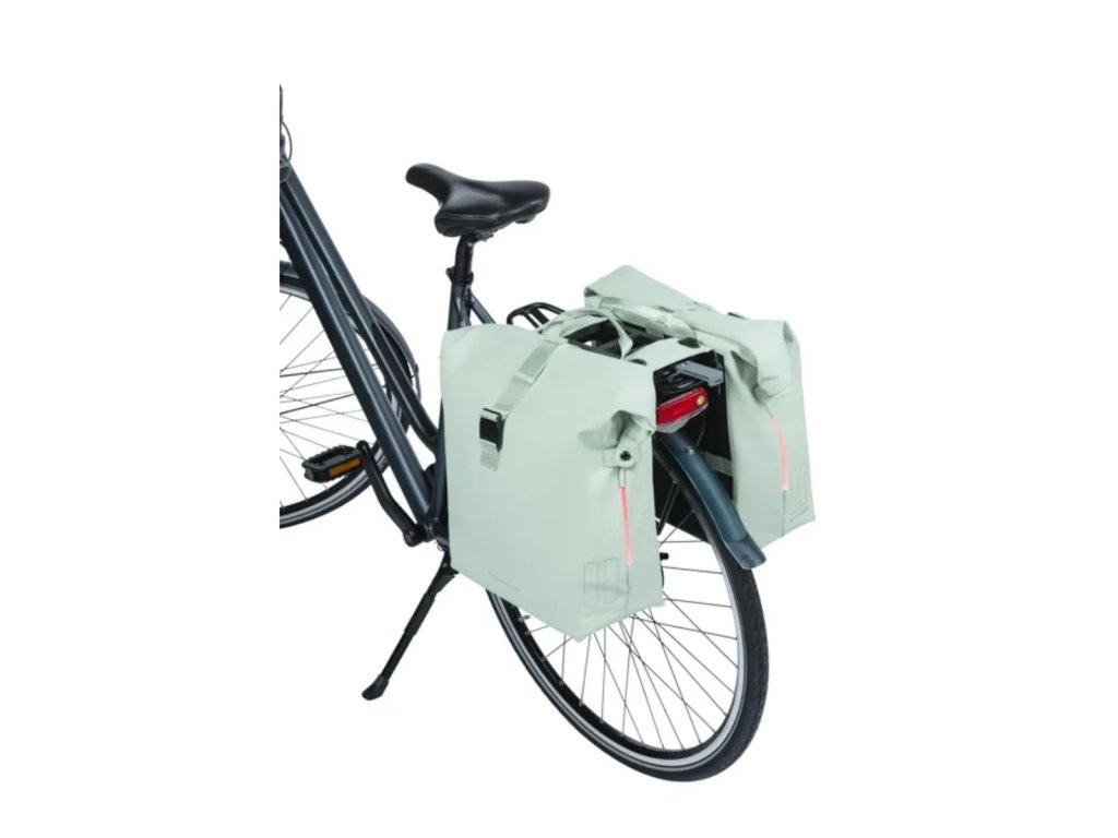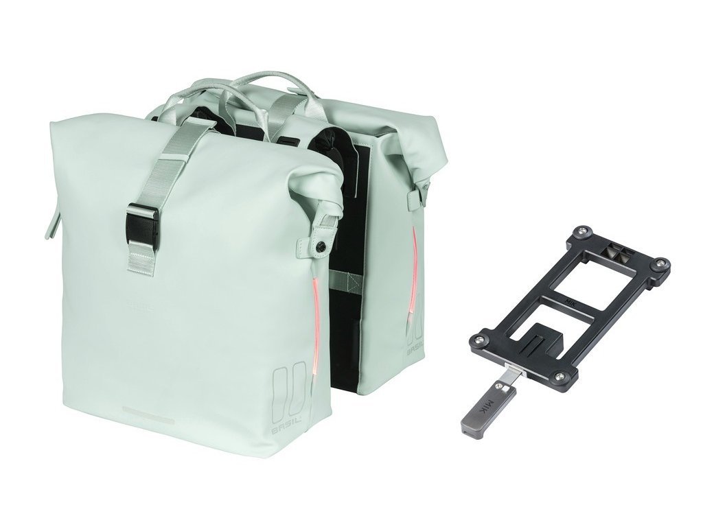 Szukasz pojemnej torby rowerowej, która jednocześnie dobrze wygląda? W takim razie podwójna torba rowerowa Basil SoHo Nordlicht MIK w pastelowym zielonym kolorze jest właśnie dla Ciebie. Torba jest wodoodporna (IPX3), więc Twoje rzeczy zawsze pozostaną suche. Torba zamykana jest za pomocą rolowanego zamknięcia, które mocuje się do boków torby za pomocą zatrzasków.Dbamy również o Twoje bezpieczeństwo. Torba jest wyposażona w technologię Nordlicht, zintegrowaną taśmę LED. Dzięki temu będziesz lepiej widoczny w ciemności. Światło LED działa na 2 baterie AAA (sprzedawane oddzielnie). Masz w torbie dużo ciężkich rzeczy? W takim razie możesz połączyć torbę z podkładką dystansową Basil (sprzedawaną oddzielnie). Ten uchwyt zapobiega wpadaniu torby w szprychy roweru.Dzięki zamontowanemu adapterowi MIK torbę można łatwo przymocować. Za pomocą tej płytki adaptera można po prostu zatrzasnąć torbę na bagażniku z profilami MIK lub na płycie nośnej MIK. Chcesz zabrać torbę ze sobą do sklepu? W takim razie po prostu ją odczep. Płytka adaptera MIK pasuje do wielu bagażników do rowerów damskich, męskich i elektrycznych. Właściwości: wodoodporna (IPX3) zamknięcie rolowane, na zamek błyskawiczny dodatkowe zamknięcie na zatrzaski pasuje do bagażników / płyt nośnych systemu MIK LED Nordlicht (bez baterii)Parametry dodatkowe