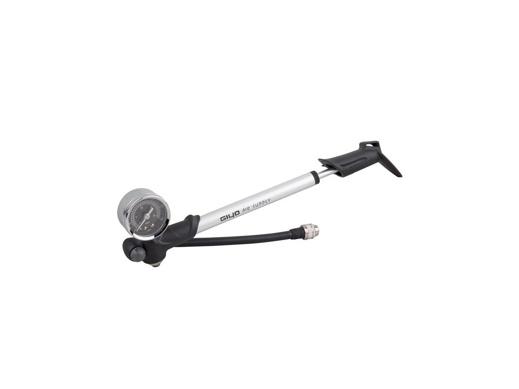 Lekka wysokociśnieniowa pompa aluminiowo-plastikowa do widelców pneumatycznych i amortyzatorów. Wyposażona w pokrętło ? do precyzyjnego napełniania. Wykorzystuje obrotowy gumowy wąż, aby uzyskać minimalną całkowitą długość.