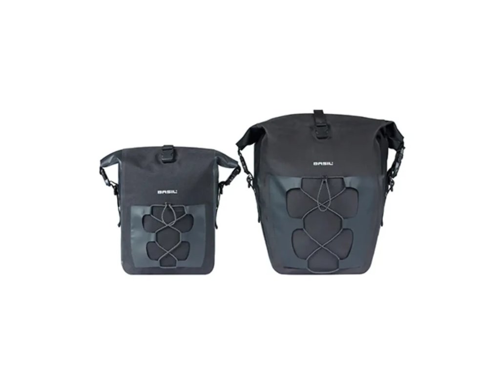 Torba zamykana jest za pomocą rolowanego zamknięcia. Zamknięcie to można obrócić na dwa sposoby: w kierunku tylnej części torby lub na górnej części torby. Zatrzaskowe zamknięcia można stosować w sposób elastyczny. Torbę rowerową mocuje się do roweru za pomocą systemu MIK Studs. Torbę można dodatkowo przymocować do ramy roweru dzięki dodatkowemu regulowanemu haczykowi w dolnej części torby. Dzięki profilom MIK można nie tylko umieścić torbę lub koszyk na bagażniku, ale także za pomocą zatrzasków MIK przymocować dodatkowe torby z boku bagażnika. Pozwala to w ciągu kilku sekund założyć i zdjąć dowolną torbę z roweru, bez wysiłku i bez uszkodzenia bagażnika. Czego potrzebujesz? Torby z kołkami MIK Studs i bagażnika z trzema punktami mocowania. Nie masz takiego bagażnika? Nie ma problemu! Dzięki osobno dostępnemu adapterowi MIK Frame nadal możesz korzystać z tego praktycznego systemu. Torba jest wykonana z połączenia taurpauliny i poliestru 600D i ma odpinany i regulowany pasek na ramię. Chcesz schować kask lub mokrą pelerynę przeciwdeszczową? Z przodu torby znajduje się odblaskowa gumka. Cechy: Duża wersja Basil Navigator o pojemności 22 litrów. Basil Navigator Waterproof ma rolowane zamknięcie z dodatkowym regulowanym zapięciem. Dzięki uchwytowi i paskowi na ramię torbę można łatwo zabrać ze sobą wszędzie. Wodoodporna (IPX 3). Posiada odblaskową gumkę jako przednią kieszeń.Parametry dodatkowe