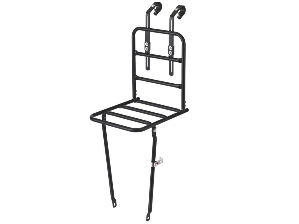 Ciężki Solidny przedni bagażnik do rowerów retro i holenderskich bez amortyzowanej widelca Przedni bagażnik L jest odpowiedni do wszystkich rowerów 26" i 28" bez amortyzowanej przedniej widelca i jest przeznaczony do dużych ładunków i koszy. Jego solidna konstrukcja z łatwością uniesie do 10 kg ładunku, mocuje się go do osi przedniego koła i za pomocą dwóch haczyków zawiesza na kierownicy. Jest więc wystarczająco wytrzymały, aby pomieścić kosze o różnych rozmiarach. Po lewej stronie znajduje się praktyczne oczko do zamocowania reflektora, dzięki czemu będziesz widzieć nawet największy ładunek.Parametry dodatkowe