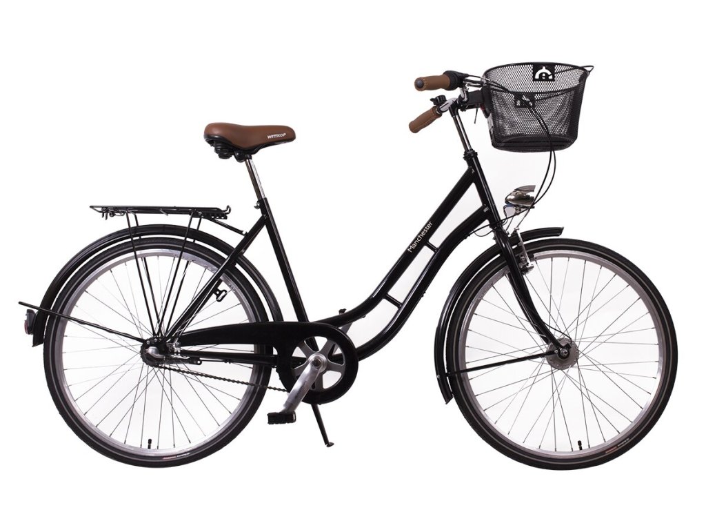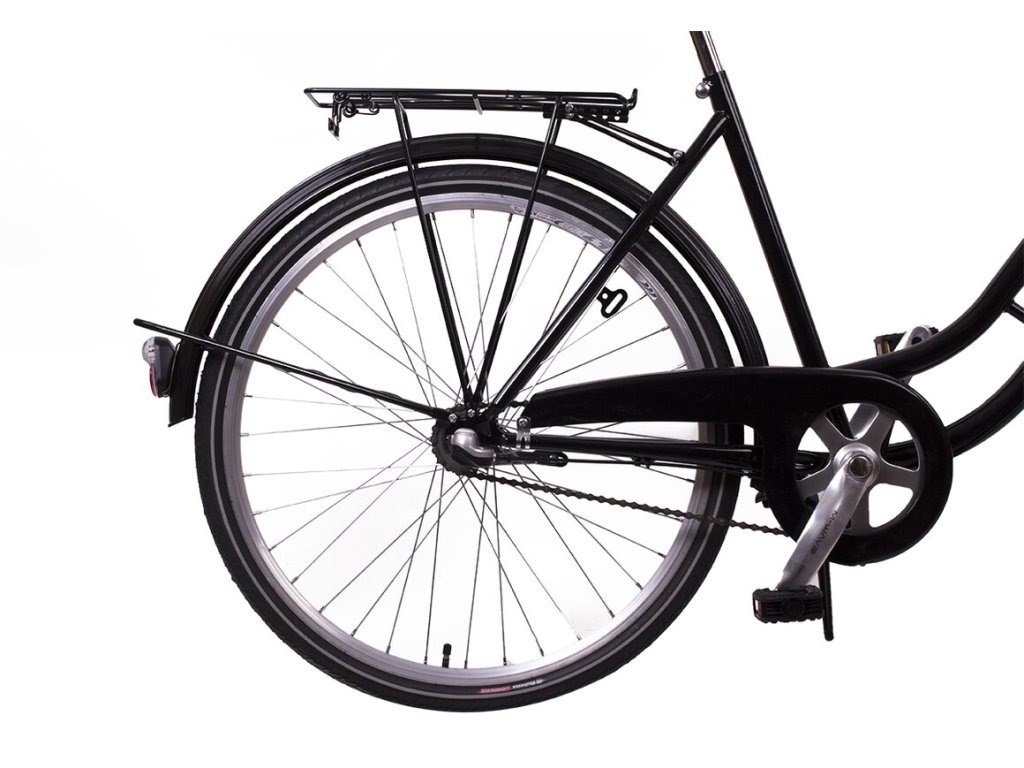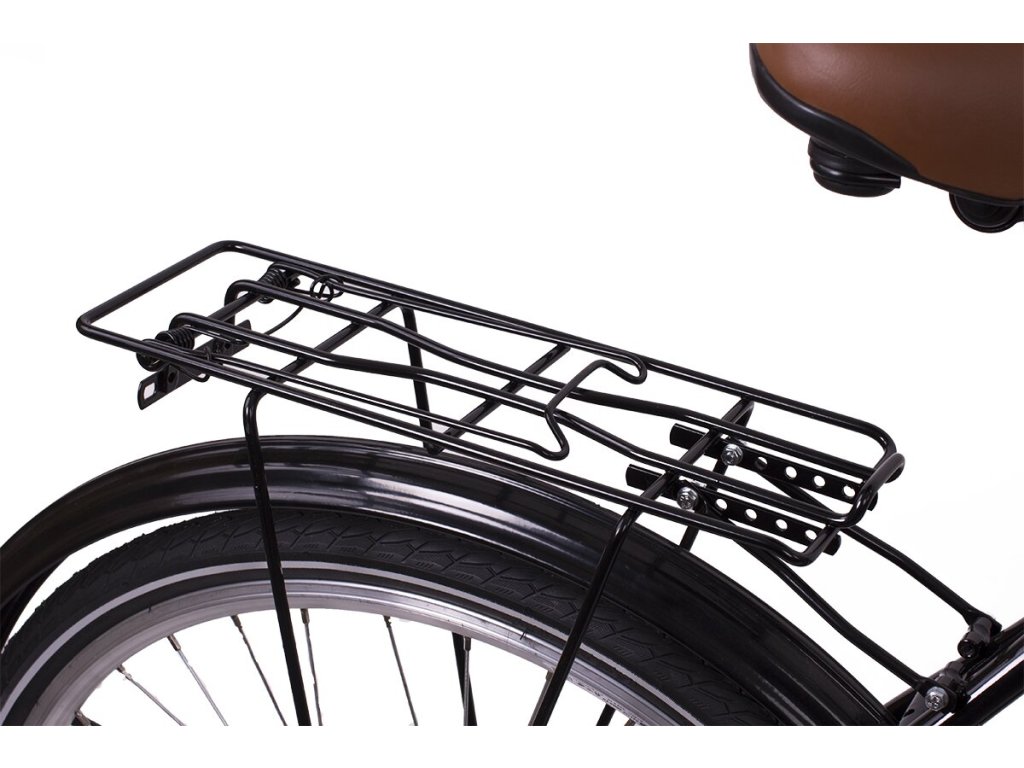 | Dodatkowe wyposażenie: | Osłona łańcucha, bagażnik, błotniki, stojak, dzwonek, skórzane siodło i uchwyty w brązowym kolorze, stojak, czarny siatkowy pokrowiec tylnego błotnika. |