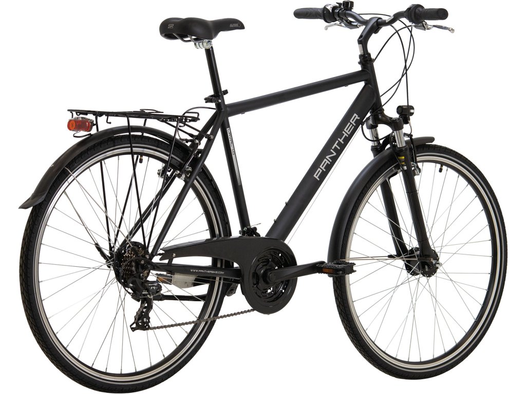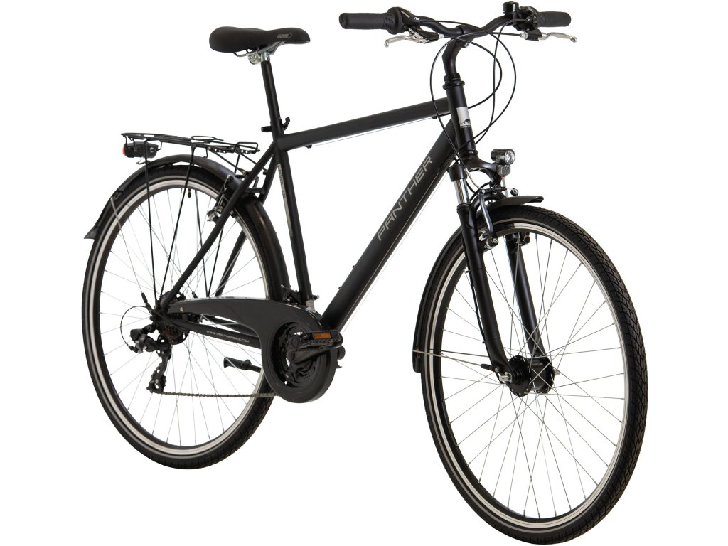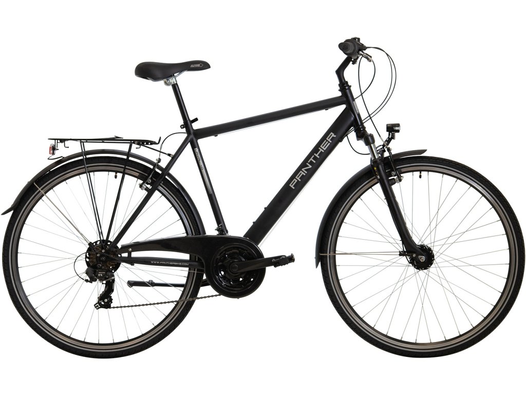 Panther Laval ma amortyzowaną widelec, hamulce szczękowe, przerzutki Shimano 3x7, oświetlenie roweru zapewnione przez dynamo w piaście przedniego koła, błotniki, bagażnik lub stojak.
