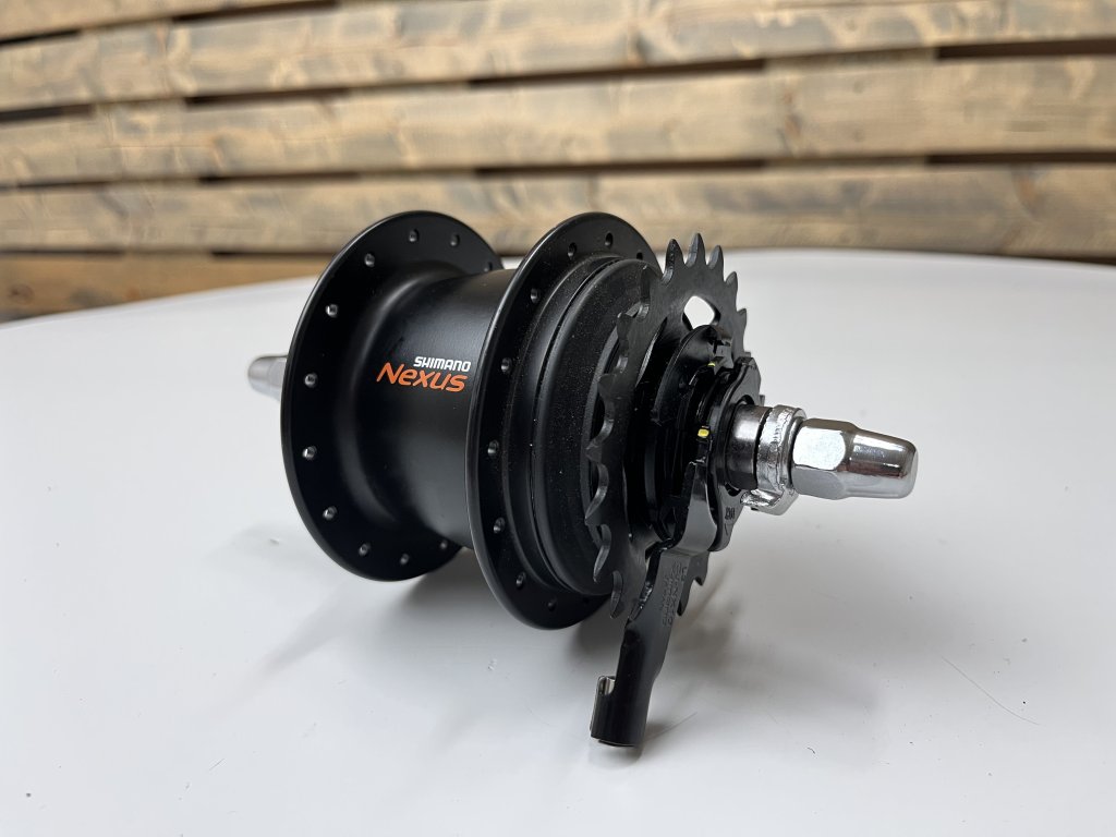 Shimano Nexus SG-C3001-7R 7 biegów bez hamulca przeciwpoślizgowego rozmiar nakrętki 130 mm zębatki z 21 zębami mocowanie przekładni + nakrętki w zestawie 32 otwory na szprychy długość osi 182 mm możliwość stosowania z hamulcem rolkowym kolor czarny stan 100%, nigdy nie używaneParametry dodatkowe