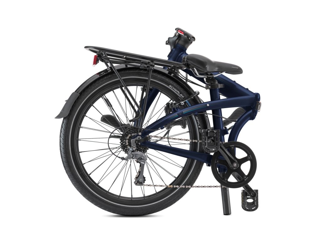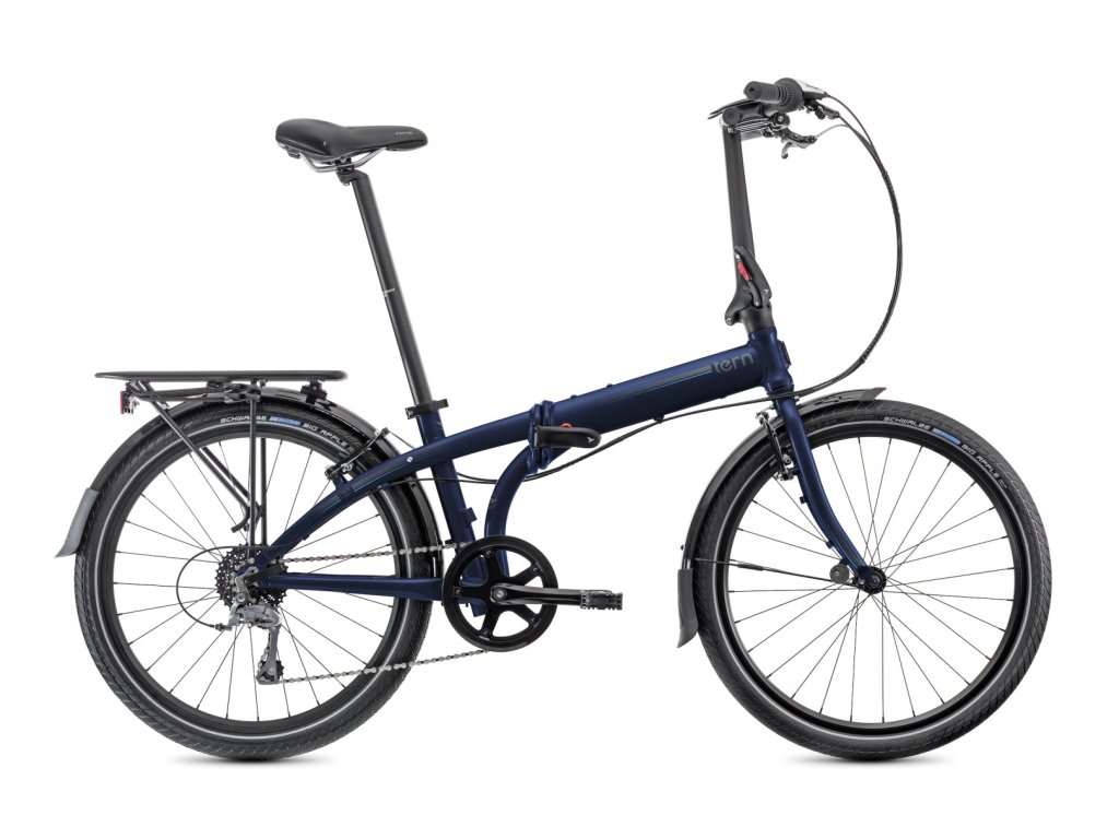 Małe, duże koło Tern Node D8 - 24" rower składany Rowery składane Tern Node mają cechy standardowego roweru, ale można je szybko i łatwo złożyć do kompaktowych rozmiarów, aby zabrać je do bagażnika samochodu, pociągu lub środka transportu publicznego, przechowywać w salonie lub na biurku w pracy. Jest to idealny rower nie tylko dla dużych i wysokich rowerzystów, ale doceni go każdy, kto lubi wygodę i szybkość dużych rowerów, a kilka centymetrów po złożeniu jest dosłownie nieistotnych. Wrażenia z jazdy na tym składanym rowerze są praktycznie porównywalne z klasycznym dużym rowerem, dzięki czemu można pokonywać nawet dłuższe trasy w różnym terenie. Te składane rowery wyróżniają się komfortem, który zapewniają przede wszystkim 24-calowe koła i szersze, wysokiej jakości opony z antypoślizgową wkładką i odblaskowym paskiem po bokach Schwalbe Big Apple 24x2,0". Ośmiobiegowa przerzutka Claris, obrotowa manetka Shimano i kaseta z 11-30 zębami oferują naprawdę szeroki zakres prędkości, zarówno podczas jazdy po stromych wzgórzach, jak i po płaskich terenach lub zjazdach. Wygodną jazdę na tym składanym rowerze zapewnia regulowany mostek Andross, który umożliwia ustawienie kierownicy w pozycji wyprostowanej lub aerodynamicznej bez użycia narzędzi. Oczywistością są wygodne, ergonomicznie ukształtowane uchwyty kierownicy, wygodne siodełko, składane pedały, podpórka i dzwonek. Rower po złożeniu ma wymiary zaledwie 39 x 86 x 84 cm i można go złożyć w 10 sekund, a złożony pakiet utrzymuje się razem dzięki opatentowanemu systemowi magnetycznemu Magnetix i paskowi mocującemu do kierownicy. Tern Node D8 waży tylko 13,3 kg, ale bez problemu uniesie rowerzystów o wzroście od 148 do 195 cm i wadze do 105 kg. Ten składany rower jest wyposażony w błotniki i tylny bagażnik.Parametry dodatkowe