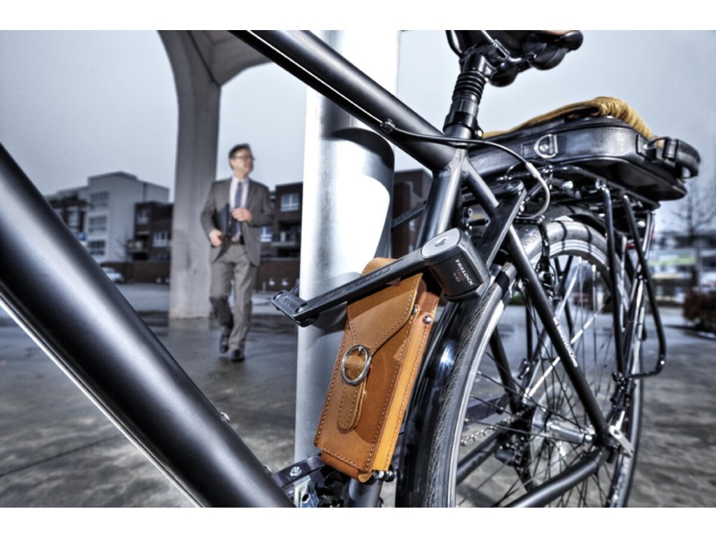 Bezkompromisowe bezpieczeństwo w skórze Zamek rowerowy TRELOCK FS300 / 85 Manufaktur w eleganckim skórzanym etui Zaawansowany zamek rowerowy z przegubem charakteryzuje się wysoką wytrzymałością i praktycznym designem – jest lekki, ładny i wytrzymały! Jednym z popularnych modeli zamków TRELOCK Trigo jest czarny zamek w eleganckim skórzanym etui, który dzięki paskom Click-in-Guide można przymocować w miejscu koszyka na bidon lub w dowolnym innym miejscu na ramie. Poszczególne segmenty stalowe są połączone tłoczonymi łącznikami i pokryte cienką warstwą tworzywa sztucznego, aby zapobiec zarysowaniu lakieru ramy. Górna blokada posiada wkładkę cylindryczną z obustronnym kluczem i zabezpieczeniem przed kurzem. Obsługa i manipulowanie zamkiem są stosunkowo proste i nie można ich porównać ze zwykłą stalową linką lub zamkiem typu U. W stanie złożonym ma wymiary zaledwie 19,5 x 5,5 x 4 cm, a jego długość wynosi 85 cm.Parametry dodatkowe
